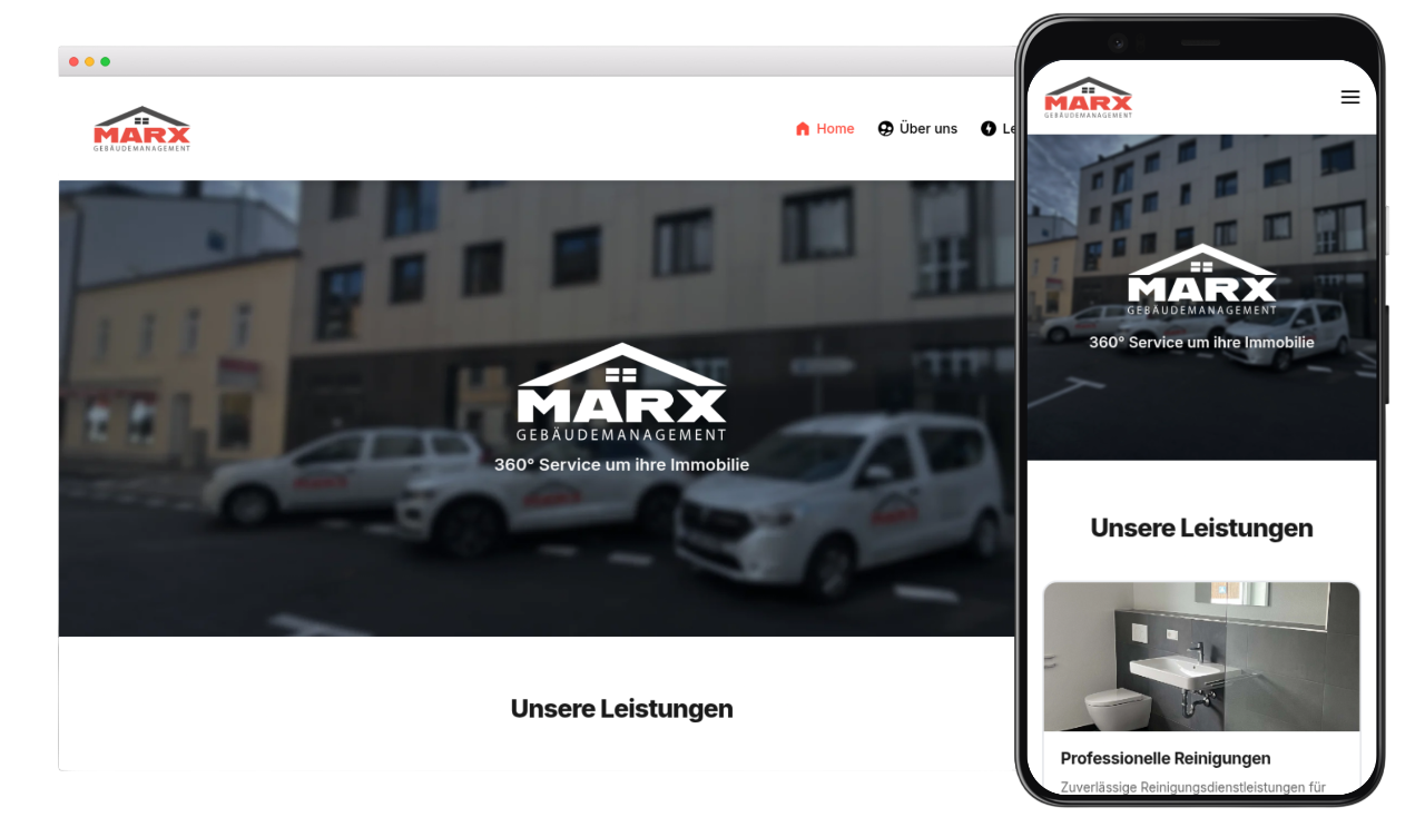 LiveAuftrag war eine professionelle, barrierearme Website für das lokale Gebäudemanagement-Unternehmen Marx. Die Seite soll Leistungen und Unternehmensprofil klar darstellen, Vertrauen schaffen und Kontaktmöglichkeiten anbieten – mit Fokus auf Nutzbarkeit auf allen Geräten, verständlicher Struktur und einfacher Pflege.